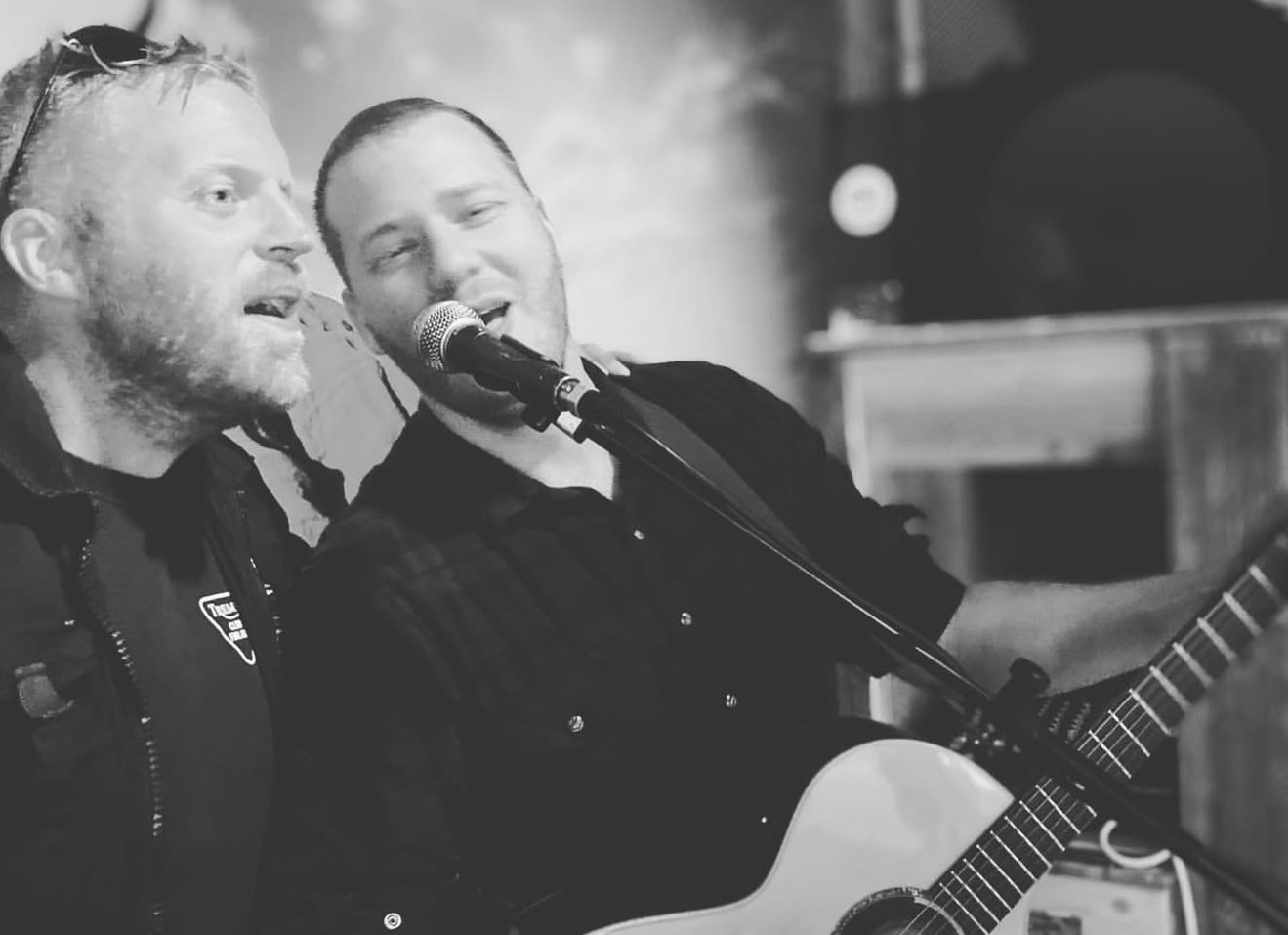 Our duo set up includes a bass drum, tambourine, a pair of guitars and at least one set of vocals.